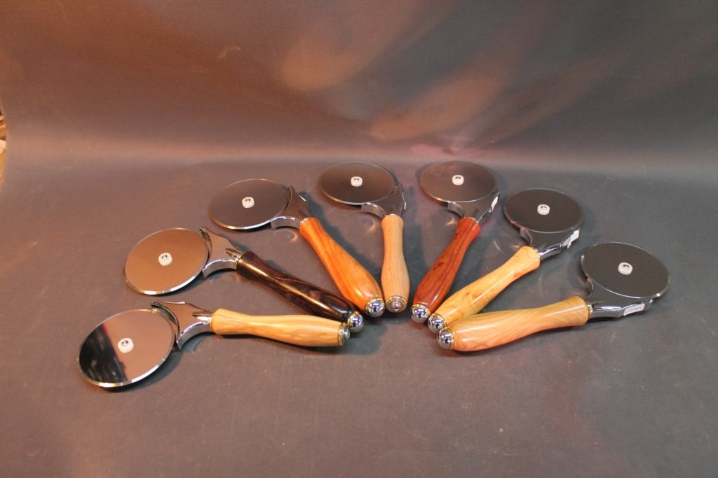 Meine Design-Pizzaschneider haben eine runde, drehbare Schneide mit 10cm Durchmesser aus Edelstahl. Der handgedrechselte Holzgriff ist abschraubbar, dadurch kann das gesamte Vorderteil mit der Klinge auch in der Spülmaschine gewaschen werden.