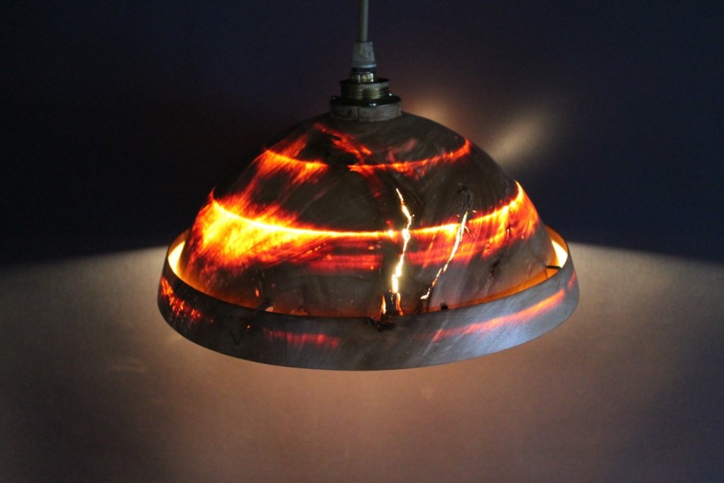 Die Hängelampe Birke 4 Elypse ist auch leicht verzogen und hat einen Durchmesser von ca 15 cm und eine Höhe von 15 cm. Das Leuchtmittel ist eine E27 LED-Filamentbirne. Am oberen Rand sind leichte, aber dauerhaft verschlossene Risse.