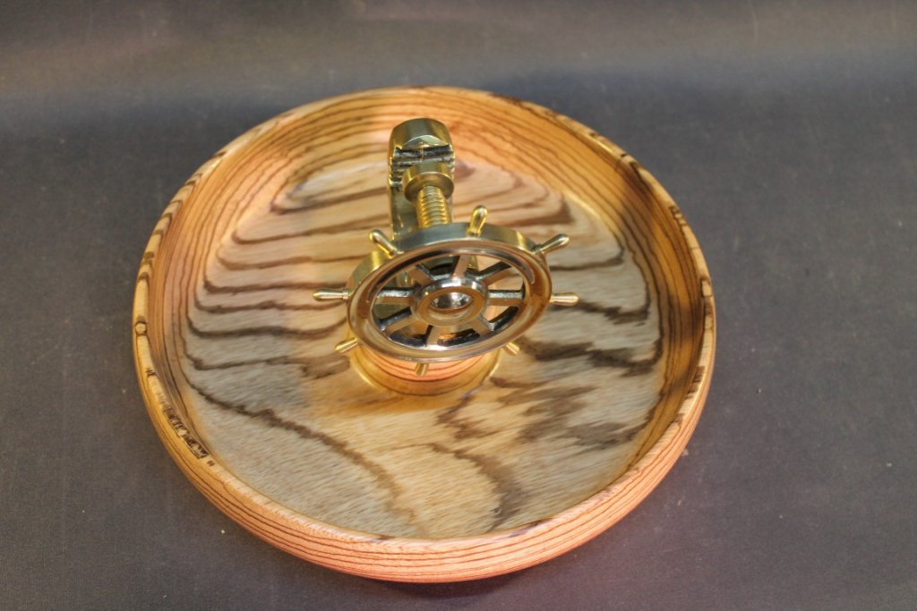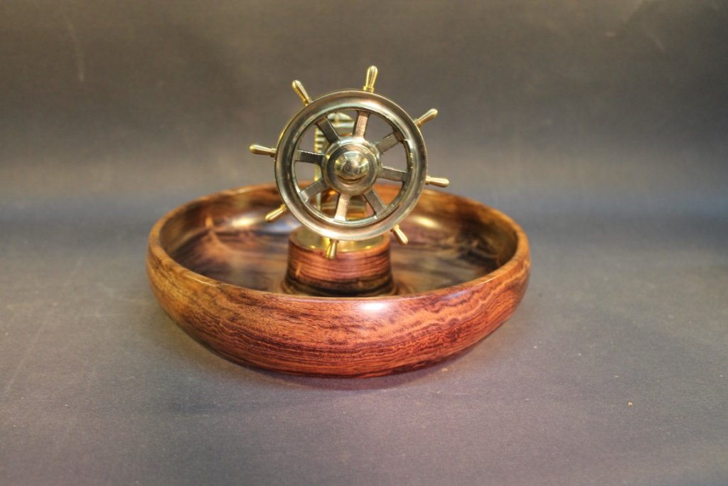 Meine handgedrechselten Nussknackerschalen haben verschiedene Durchmesser und sind aus verschiedenen Hölzern. Die Nussknacker selbst haben die Form eines maritimen Steuerrades und bestehen aus Messing. Der Steuerraddurchmesser beträgt 10cm.